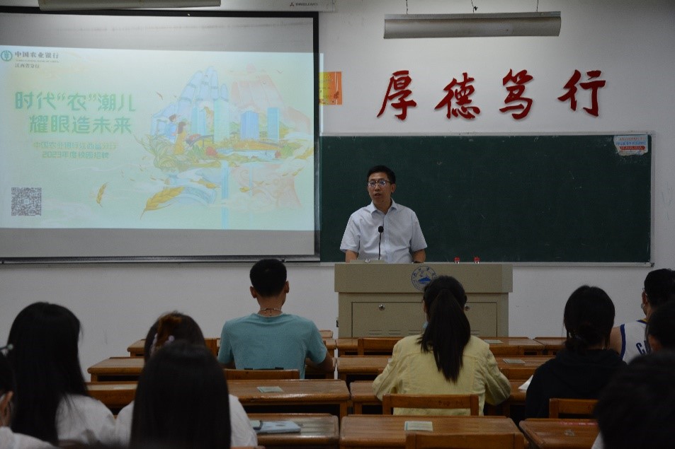 随后,徐舜向所有参加宣讲会的同学分发银行的宣讲传单,通过ppt播放和宣讲人的介绍了解到,中国农业银行是国内经营规模最大的现代化商业银行之一,江西省分行作为中国农业银行37家一级分行和直属分行之一,拥有全省最完善的金融服务网络。网点、自助设备数量均居四行首位。凭借遍布全省城乡的营业网点、自助设备和电子化网络,齐全完善的本外币产品体系,雄厚的资金实力,优良的社会信誉,赢得社会各界的普遍认同。紧接着,他就招聘详情、薪酬福利和职业发展为同学们展开了详细讲解,不少同学在了解到银行对于青年成长培养的重视后表达了就业倾向,并在就业方面的问题与银行工作人员深入交流,宣讲会现场氛围良好。